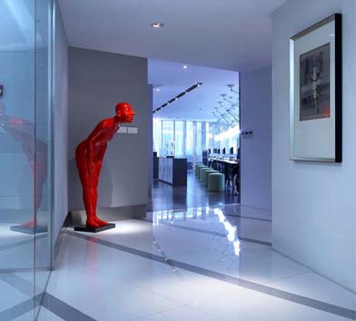 創(chuàng)意辦公室設(shè)計(jì)主要的是與眾不同的體現(xiàn),進(jìn)入辦公室給人一種眼前一亮的感覺??紤]到陽(yáng)光朝向?qū)k公環(huán)境的影響,室內(nèi)桌子和電腦顯示器遮蔽在靠南的陰影下,另一側(cè)的墻壁擺放各種物件,亂中有序。南寧創(chuàng)意辦公室設(shè)計(jì)裝修,南寧創(chuàng)意辦公室設(shè)計(jì)的設(shè)計(jì)師特別通過色彩對(duì)透明開放和封閉的兩部分進(jìn)行對(duì)比,室內(nèi)搭配明快的顏色,白色、紅色、綠色裝飾物,與室內(nèi)墻面和地面灰白色形成強(qiáng)烈的對(duì)比,顯得跳躍,生機(jī)勃勃。