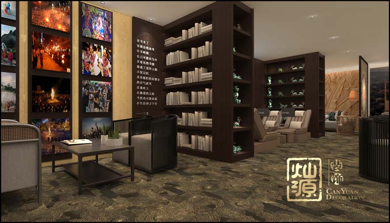 文化展示區(qū)和閱讀室展示了北京德人企業(yè)的文化,讓貴賓接待室設(shè)計(jì)裝修空間具有一定的“閱讀性”,而全部的展架采用深色的木質(zhì)展架不僅是在新中式空間風(fēng)格上的統(tǒng)一,更是傳達(dá)一種穩(wěn)重大氣的態(tài)度。